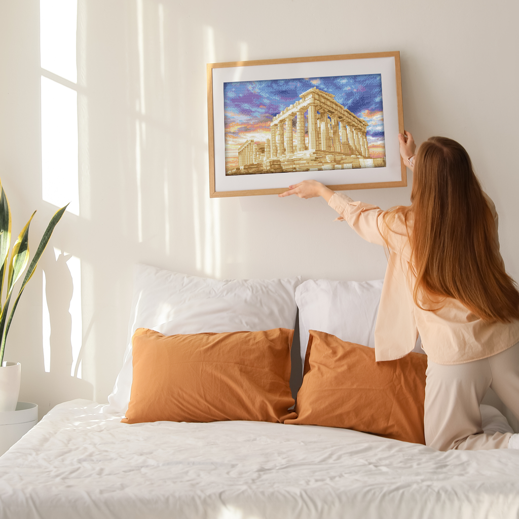 Step into the grandeur of ancient Greece with Parthenon Temple. This advanced-level Diamond Painting Kit for Adults recreates the iconic Acropolis landmark in glittering detail using our signature square-shaped Dotz. Whether you're passionate about history or dreaming of a Greek getaway this diamond art travel masterpiece is a striking tribute to classical beauty and architectural marvels.