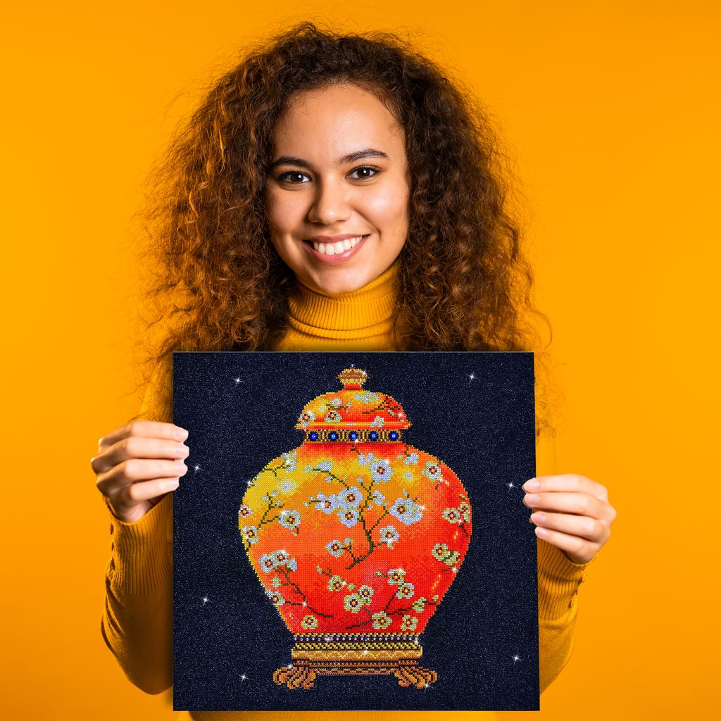 Red Vase is a bold and vibrant floral diamond art that combines deep reds and rich greens for an eye-catching floral centerpiece. Using round-faceted diamonds on full-drill printed fabric this design is perfect for adding energy to your collection of Diamond Art Kits.
