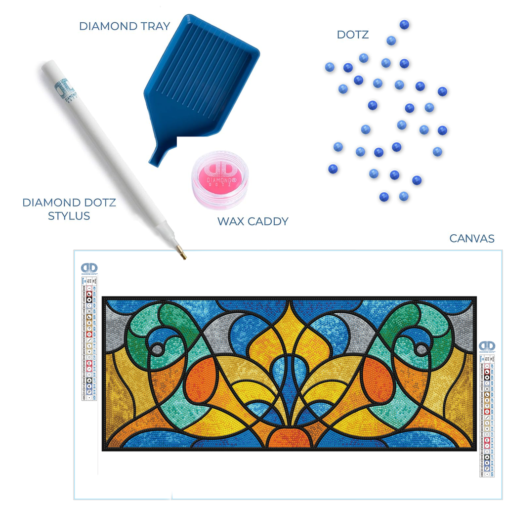 Diamond Dotz Stained Glass Study - 22.8" x 9.5": Add a bold pop of color to your craft collection with the Diamond Dotz Stained Glass Study a radiant abstract diamond painting inspired by the beauty of classic stained glass art. This eye-catching design features sweeping curves and jewel-toned shapes that mimic leaded glass brought to life with round Dotz and full coverage. A rewarding intermediate project it's a standout in both Diamond Painting Kits for Adults and Diamond Art Kits collections.