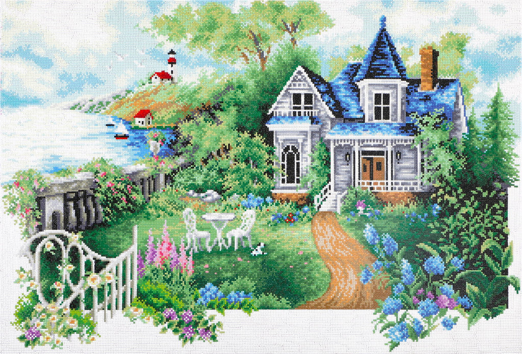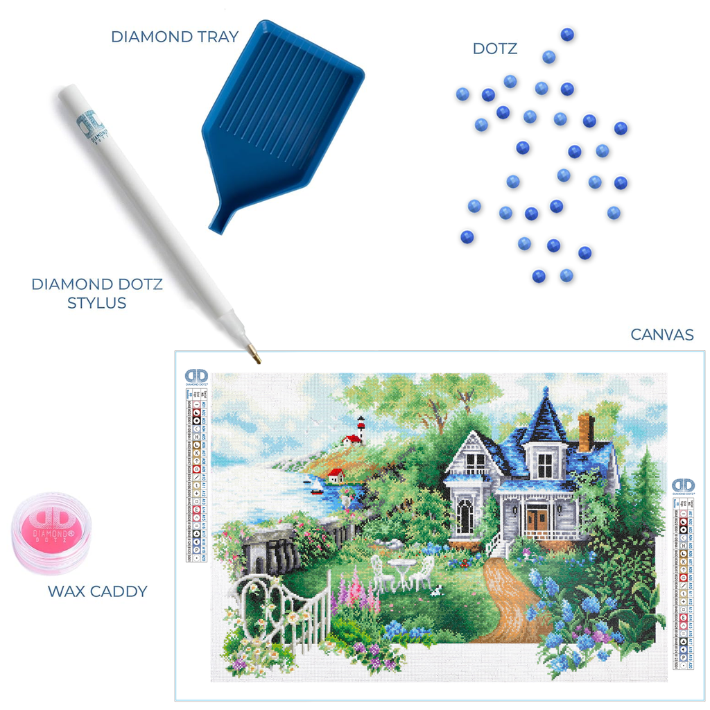 Diamond Dotz Summer Hideaway - 35.4" x 24.0": Escape to a peaceful cottage retreat with the Summer Hideaway Diamond Painting Kit a charming coastal scene bursting with flowers greenery and the warmth of the season. This full-coverage masterpiece is ideal for advanced crafters who enjoy immersive vibrant detail. A perfect addition to any collection of Diamond Painting Kits for Adults or Diamond Art Kits this landscape captures the beauty of quiet moments by the sea. Ideal for fans of summer diamond art and diamond art summer this kit offers a refreshing creative escape.