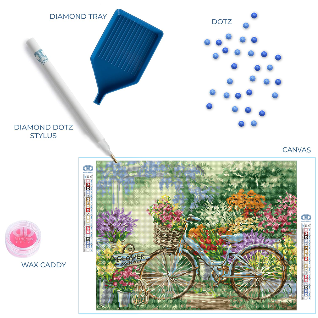 Bring the charm of a countryside market to life with the Diamond Dotz The Flower Mart Diamond Painting Kit created by artist Dona Gelsinger. This delightful scene features a vintage bicycle surrounded by vivid blossoms and a quaint market sign making it a perfect project for those who love Diamond Painting Kits for Adults and Diamond Art Kits.
