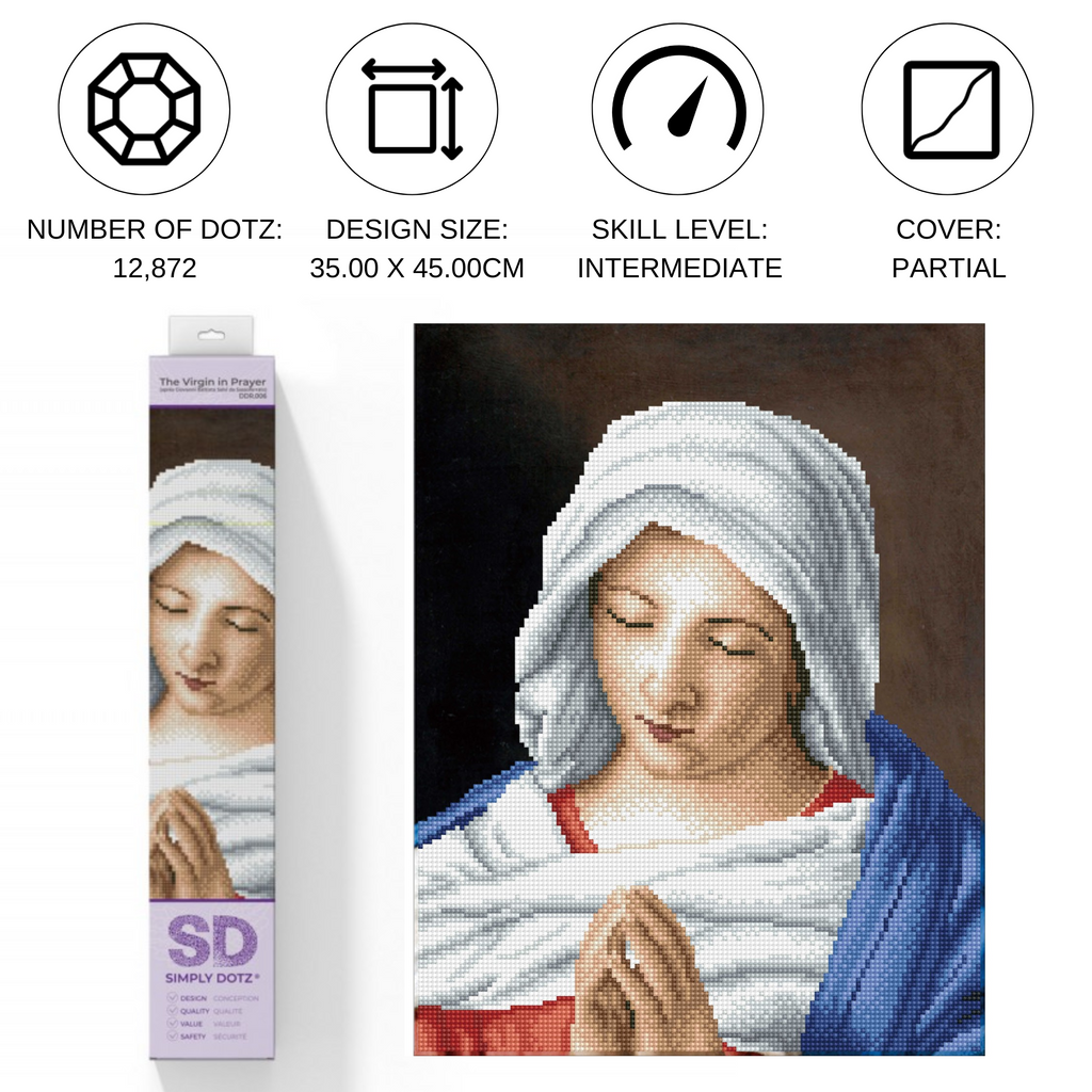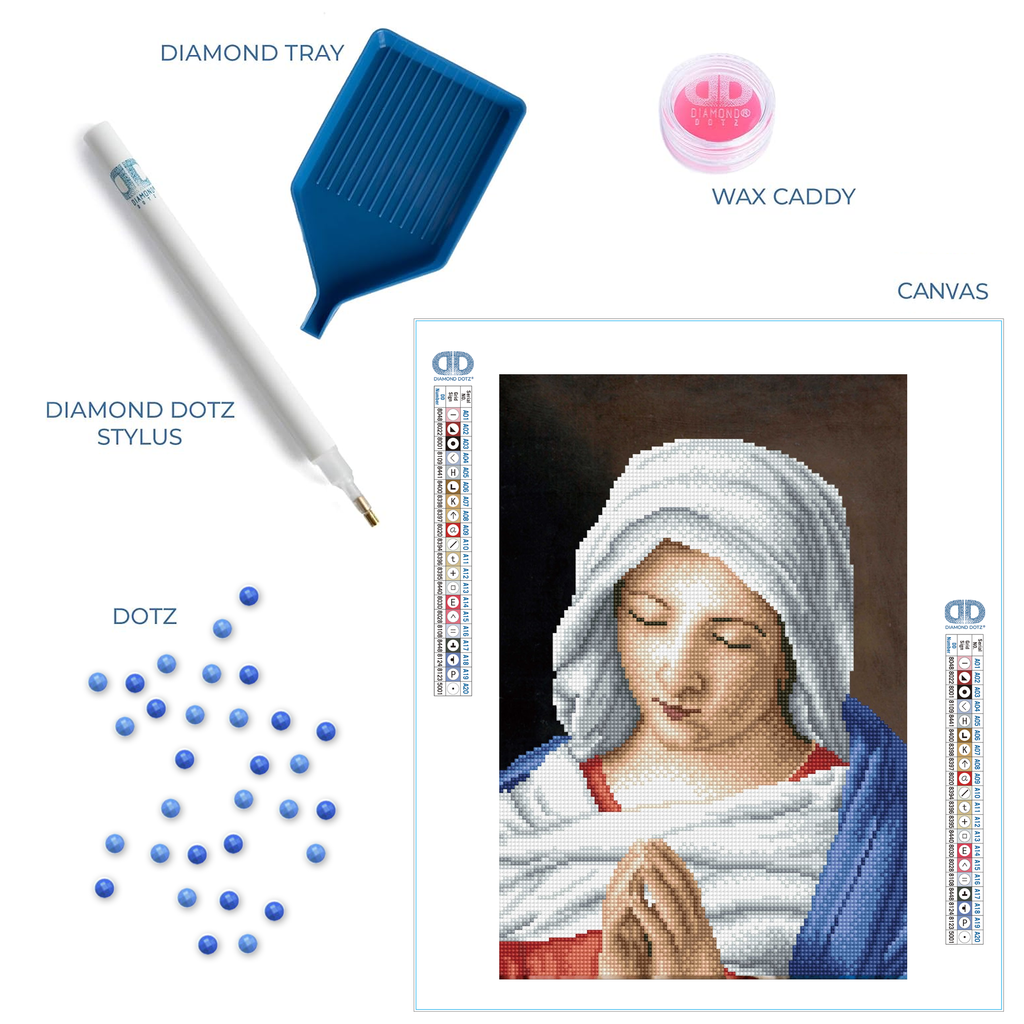 Diamond Dotz The Virgin in Prayer apres Giovanni Battista Salvi da Sassoferrato - 13.8" x 17.7": Capture the sacred serenity of the The Virgin in Prayer Diamond Painting Kit based on the beautiful artwork by Giovanni Battista Salvi da Sassoferrato. This serene image of the Virgin Mary in prayer will add a touch of reverence and beauty to your collection.