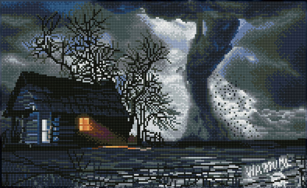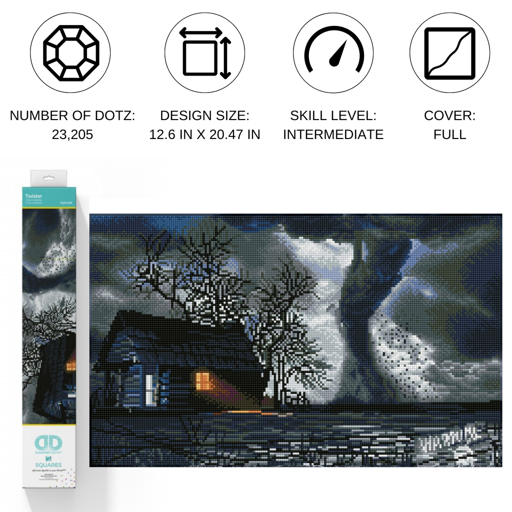 Diamond Dotz Twister - 20.5" x 12.6": Feel the power of nature in the Diamond Dotz Twister diamond painting landscape. A dramatic tornado swirls behind a lone cabin its warm window glowing in contrast to the stormy sky. With full coverage and square-shaped diamonds this Diamond Art Kit is a bold project for fans of Diamond Painting Kits for Adults Diamond Art Kits and intense atmospheric landscape diamond art.