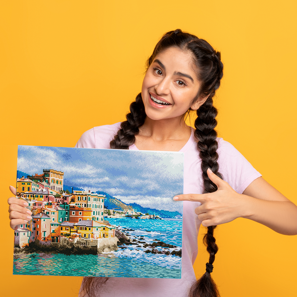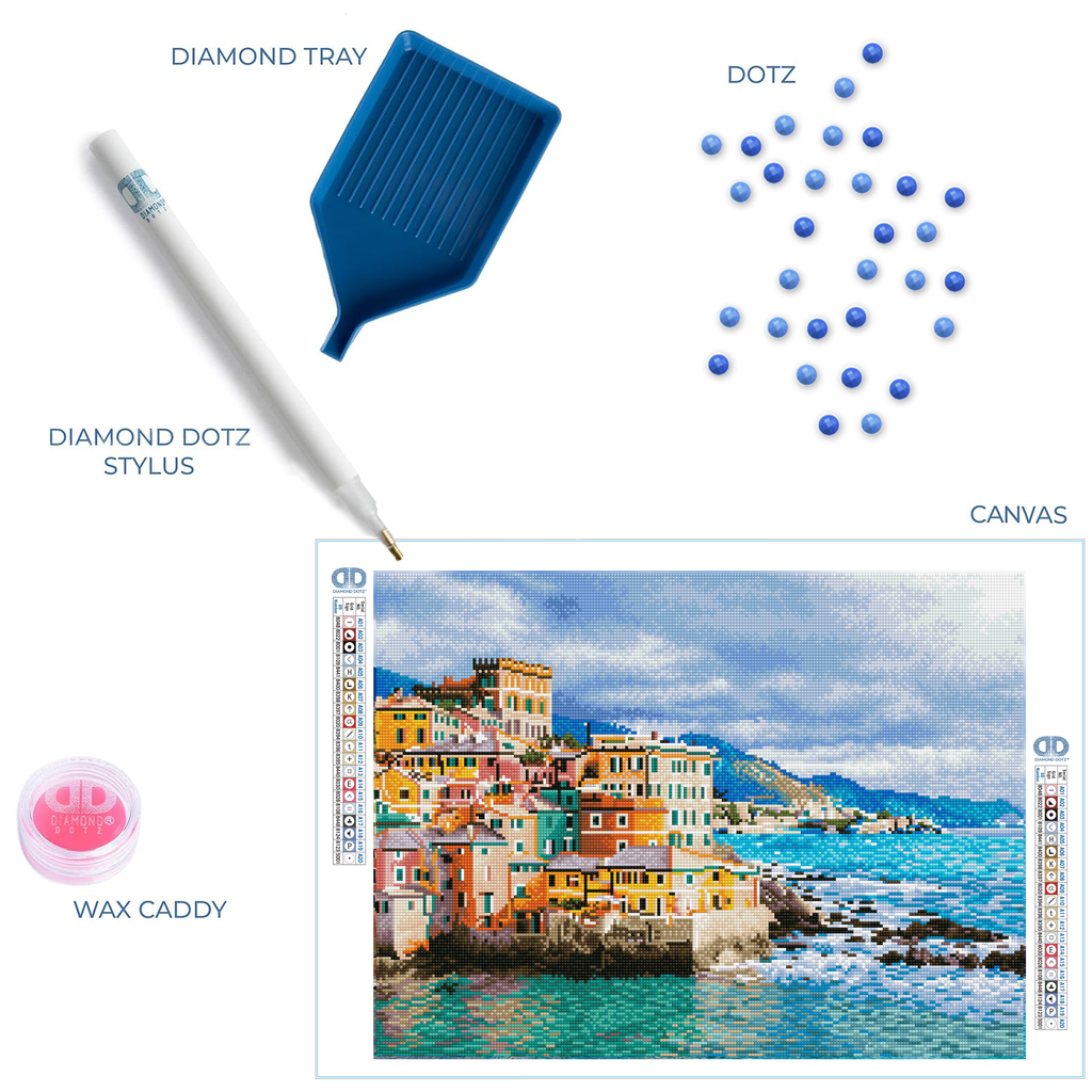 Diamond Dotz Winter Day View - 24.8" x 18.5": Capture the coastal charm of Genoa with the Diamond Dotz Winter Day View Diamond Painting Kit. This scenic artwork features a colorful cliffside village along a turquoise sea under a crisp winter sky. A stunning design for fans of Diamond Painting Kits for Adults and Diamond Art Kits who love vibrant landscape diamond art.