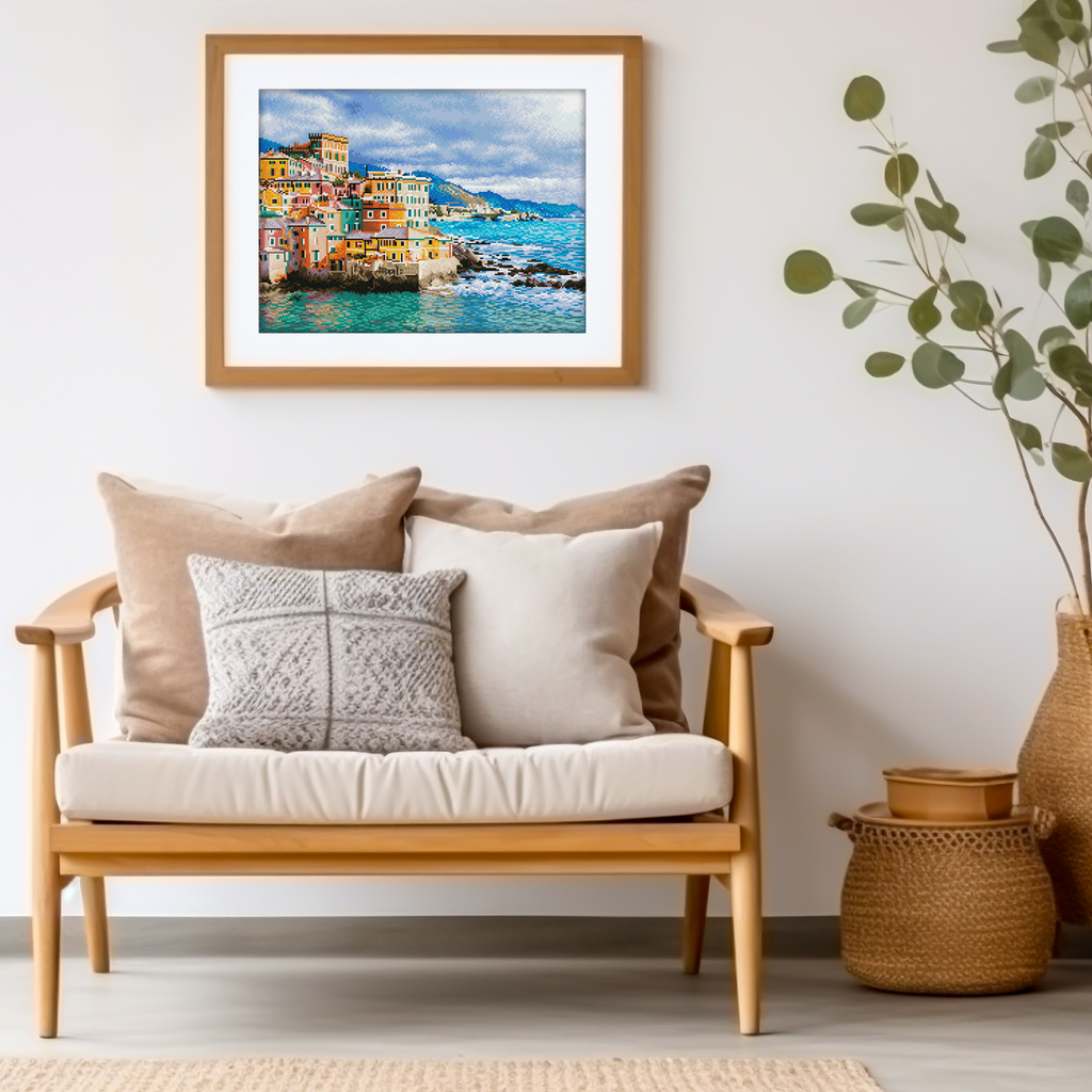 - Picturesque Italian coastline scene with detailed waves buildings and sky