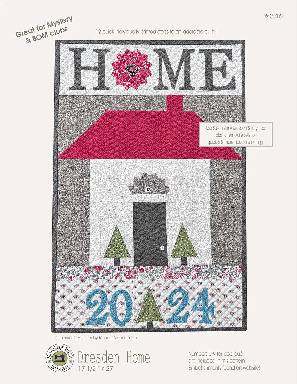 This little quilt is perfect for a mystery or block-a-day, week or month. A cute & clever little quilt to hang on your wall or door. Change the date for any occasion. It's written in 12-steps but can easily be made in a day! Pattern includes detailed Tiny Dresden plate assembly instructions as well as full-size, reversed, appliqué templates, including all numbers 0-9 so you really can make this YOUR Dresden Home! Steps include quilting tips & also failproof binding with quilt label too. Paper templates are included in pattern, but companion plastic templates Tiny Dresden plate SUZ216 & Tiny Trees SUZ286 are available. Each block's instructions are printed on individual sheets for easy distribution for shop club meetings. A wonderful 12-day project for even a beginner.