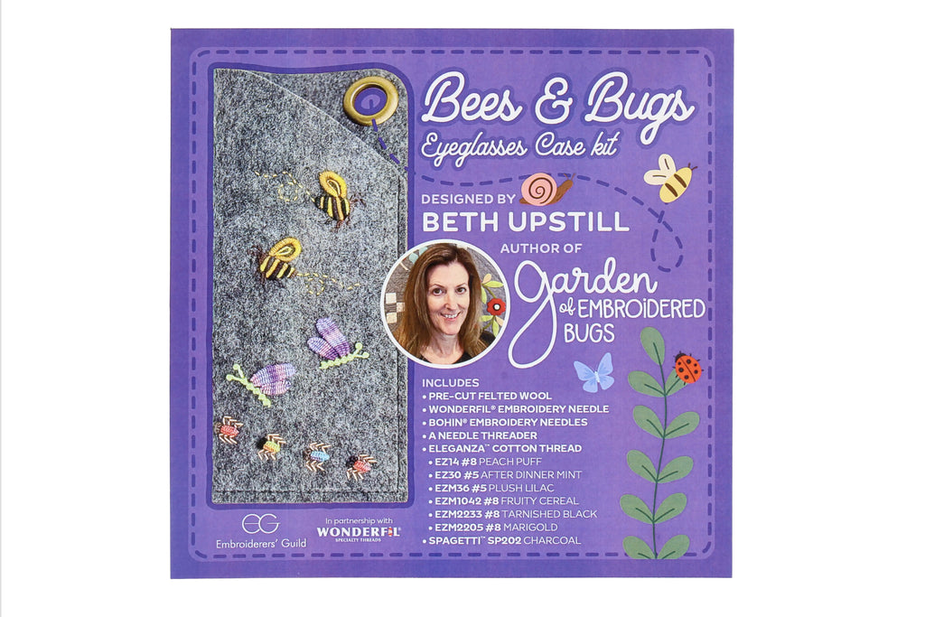 WonderFil is partnering with the Embroiderers’ Guild UK to put on a fantastic workshop with incredible stitcher Beth Upstill of West Coast Wool. This kit has been tailored with everything you need to stitch along with Beth in her online workshop Saturday, 12 July to create a felted wool glasses case with embroidered bugs of your very own.