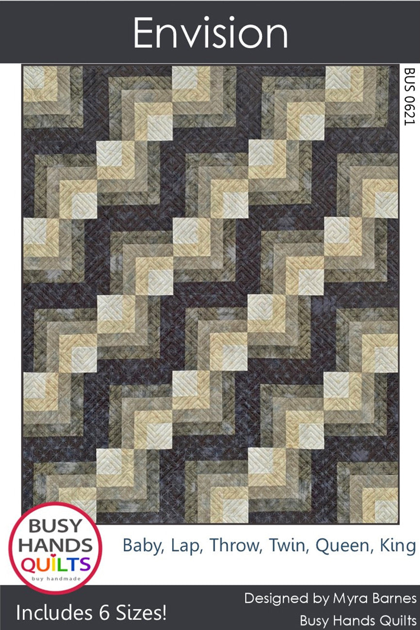 Envision is a delightful gradating ombre quilt pattern highlighting a single colorway. Choose five hues from light to dark. This pattern includes six sizes – Baby, Lap, Throw, Twin, Queen, and King – and is quick and easy with beautiful results. Using two fabrics of similar hue changes up the look of the quilt, as seen in the purple version on the back cover.