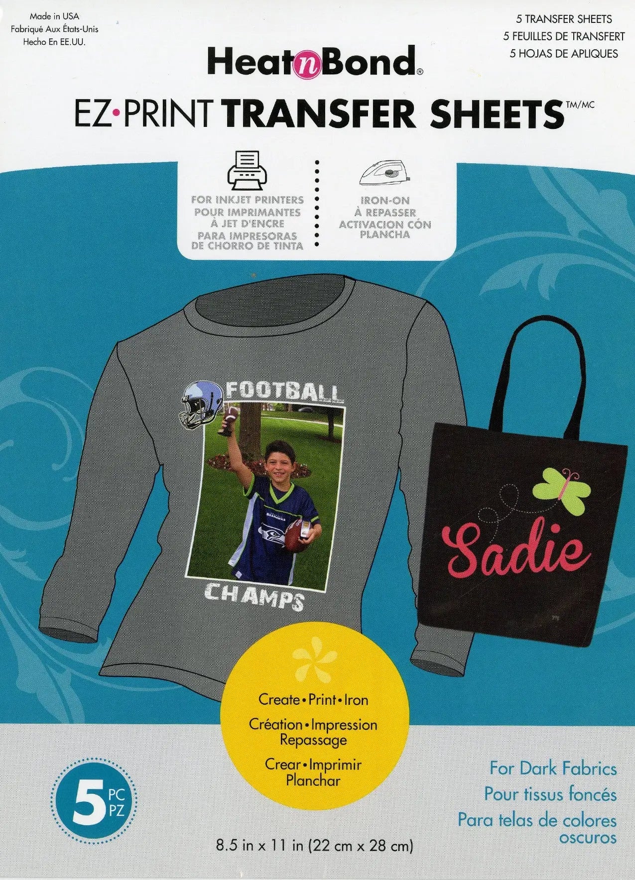 HeatnBond EZ Print Inkjet Transfer Sheets for Dark Color Fabrics are designed to easily personalize t-shirts, apparel, crafts and more with your favorite photos, logos and images.