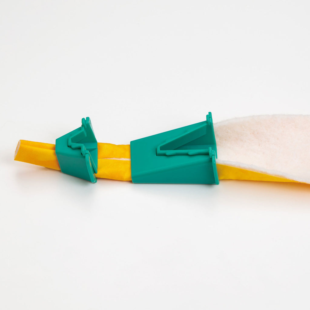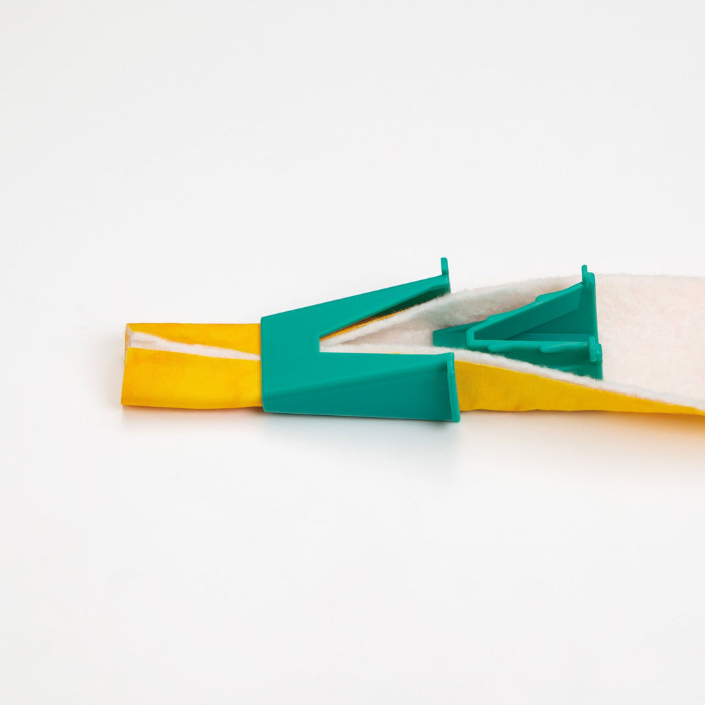 The Jelly Roll Fabric Tube Maker eliminates the need to hand fold and clip your fabric and batting strips before you sew. Insert your strip sandwich into the tool, and easily pull them through. The tool folds the sides of your strips in, then folds that in half, ready to sew.