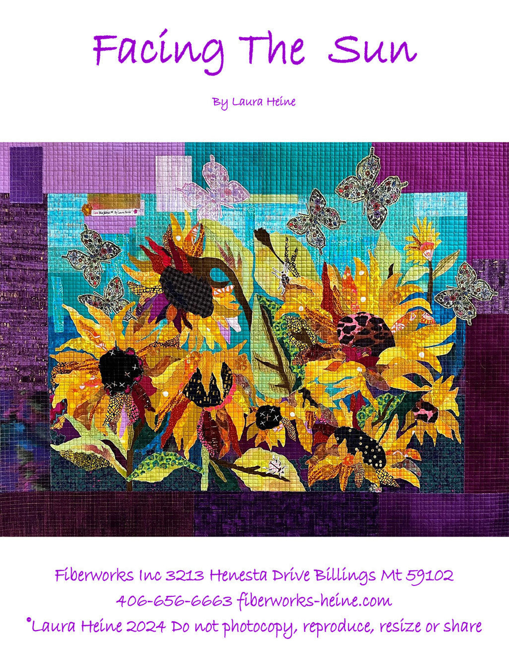 Facing The Sun (Sunflowers) Collage Pattern by Laura Heine. The meaning of sunflowers stems from their very nature-Facing The Sun. They symbolize unwavering faith and constant orientation towards the light. They are often associated with optimism, positivity and happiness. Pattern includes colorful full size step by step instructions to complete this collage. Finished size 44x32.