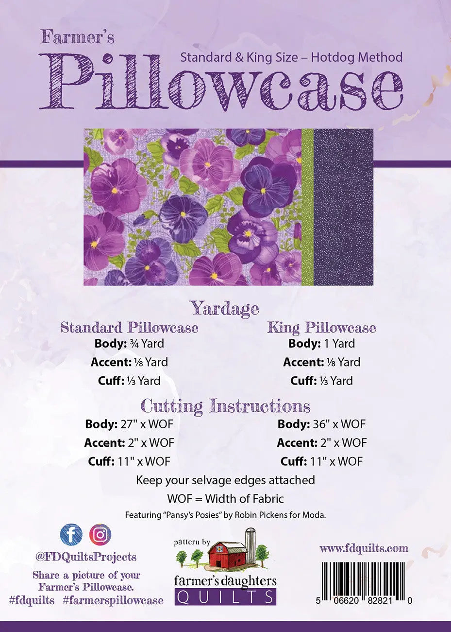 Postcard Pattern from Farmer's Daughters Quilts! 5 pack of patterns. Farmer's Pillowcase Pattern uses the Hotdog Method (aka Burrito Method) to create two different sizes of Pillowcases, Standard Size (20" x 26") and King Size (20" x 36"). The pattern is printed in full color with easy-to-follow instructions and graphics.