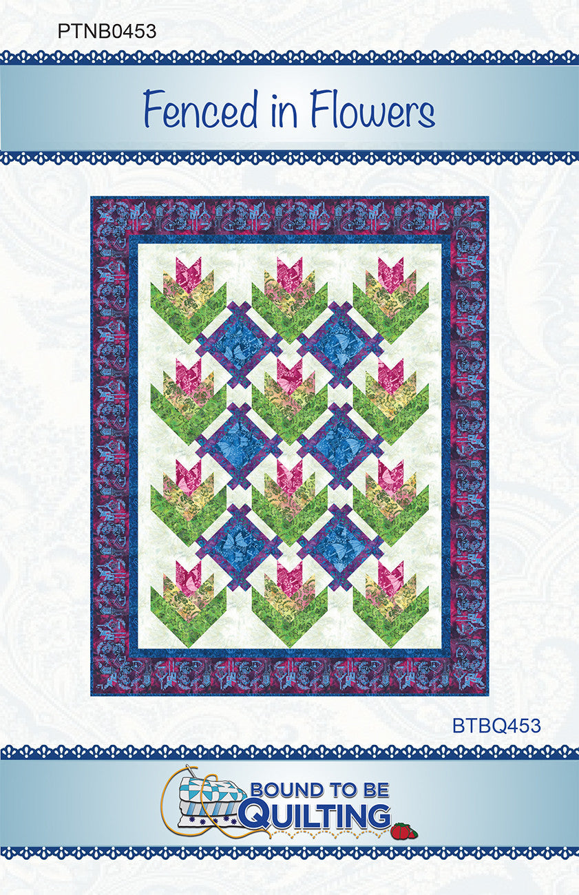 Fenced in Flowers: Alternate "fence" and "flower" blocks show off the bright fabrics in the Secret Garden collection by Bound To Be Quilting for Banyan Batiks. Finished size is 66" x 83". Skill level is confident beginner.