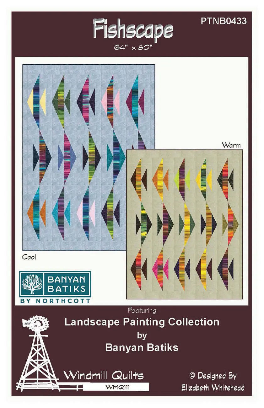 Fishscape is a 64" x 80" twin sized quilt featuring the Landscape Painting Collection from Banyan Batiks by Northcott. This modern style quilt is traditionally pieced suing the Half Rectangle rulers. Both colorways are represented in the pattern.