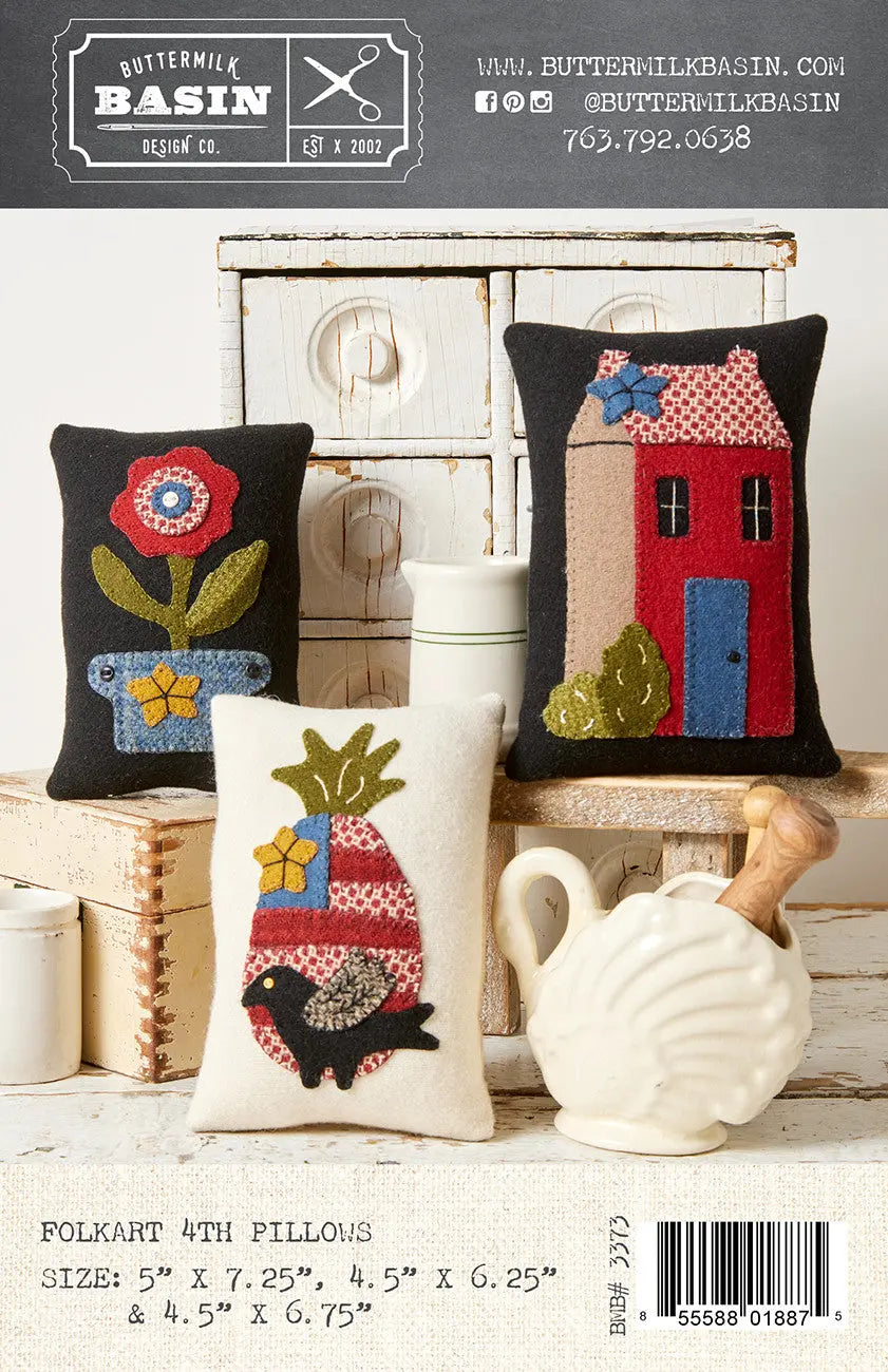 Folkart 4th Pillows: Size: 5 X 7.25, 4.5 X 6.25 & 4.5 X 6.75 inches. A little piecing and a dash of wool makes this trio of pillows come to life! Nest in a dough bowl and enjoy!