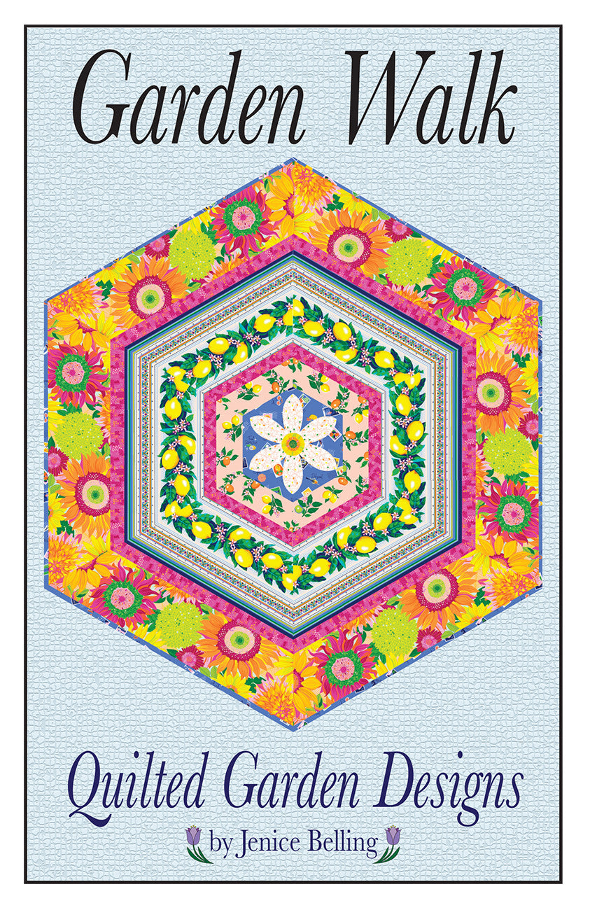 Garden Walk: 40x46. Five pretty borders cut from strips with included paper templates are pieced together to create wedges. The six sections all come together easily and finished with the center being appliquéd and an added flower for the finish on this great topper.