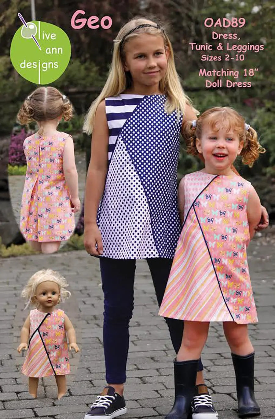A stylish design that is very easy to make and fun to wear. The A-line dress and tunic have a boat neckline with a pleat and keyhole closure in the back. Optional piping along the seams in the dress front gives an easy-to- add accent. Includes a pattern for knit leggings. Comes with a matching doll dress pattern that fits most 18” dolls or the “Best Buds” olive ann doll. Fabric on the cover is Riley Blake. Available in tissue pattern with complete, detailed and easy to follow instructions.