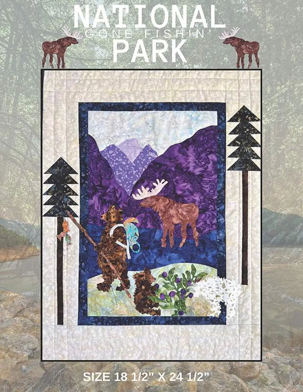The Gone Fishin' Quilt by Gwen Carreon Designs features appliqued bears, mountains, and a moose. Finished size is 18 1/2" x 24 1/2".