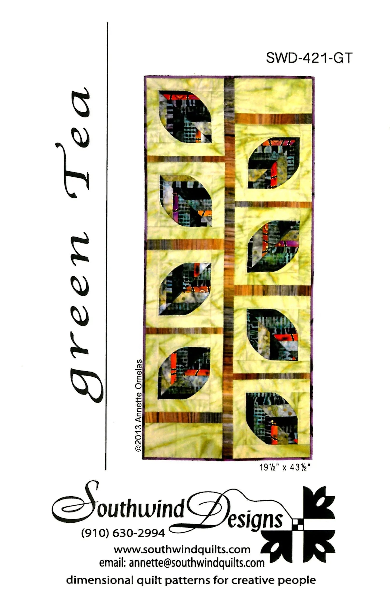 Discover the charm of "Green Tea," a delightful wallhanging or table runner that measures 40-1/2 inches by 17-1/2 inches. This project features eight fun and easy strip-pieced dimensional leaf blocks, utilizing straight-line piecing to achieve beautifully curved results. The leaves are arranged in an offset pattern, creating a visually appealing design on a light background with medium sashing. Perfect for all skill levels, this pattern allows you to craft a piece that's both modern and traditional, with dimensions of 19-1/2 inches by 43-1/2 inches when finished.