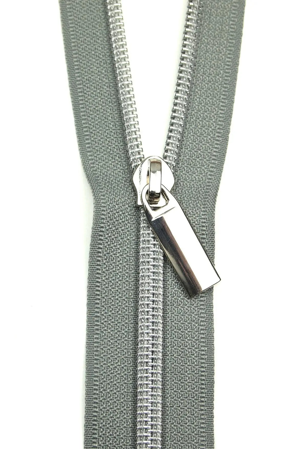 Grey #5 Nylon Nickel Coil Zippers: 3 Yards with 9 Pulls