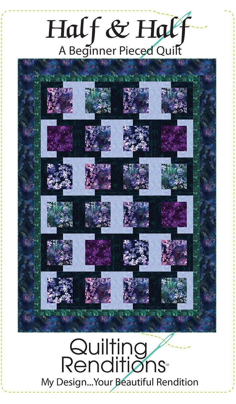 Half & Half: Fun Fat Quarter pattern with multiple layout options included. Use those great contrasting fabrics with your beautiful prints and make it shine!! Three sizes, Lap 51" x 61", Twin/Double 62" x 86", Queen 86" x 110".