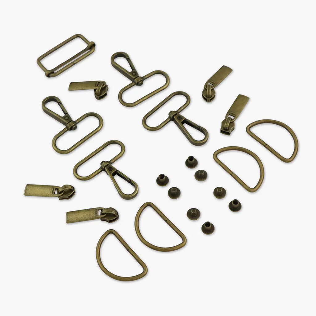Hamilton Hardware Kit Antique: The Sallie Tomato Hardware Kit with a metal finish provides the four D-rings, four swivel hooks, and one slider buckle you need to make the Hamilton carry-on duffle bag, whose name was inspired by the hometown of Missouri Star! Make the roomy duffle from our Missouri Star exclusive pattern and then pack it for a visit to Quilt Town!