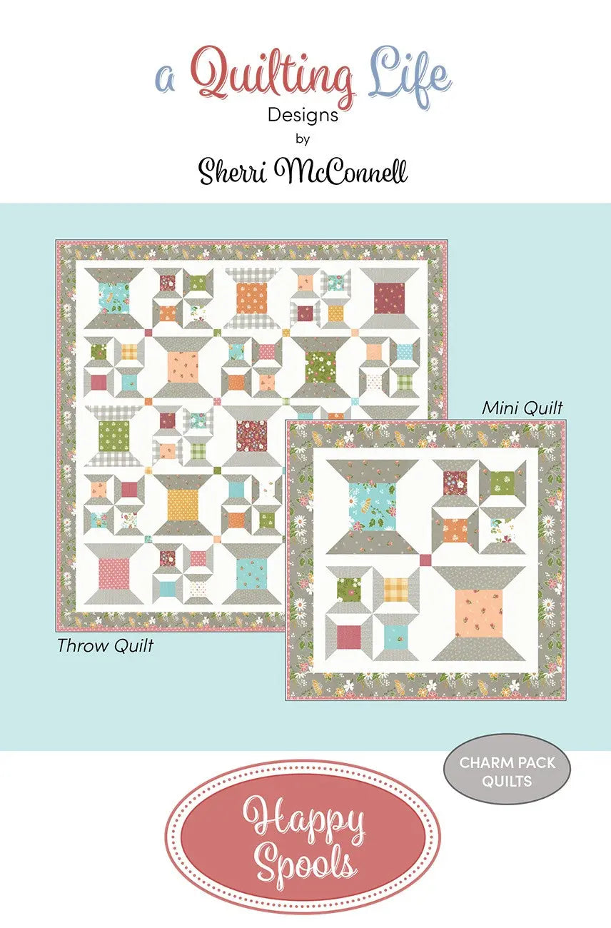 Pattern for a 50" x 50" throw and 23" x 23" mini quilt featuring spools blocks in two sizes.
