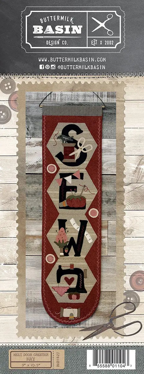 The May Hexi Door Greeter will look especially great in a sewing room, or any where, with a sewing theme! Thread, pincushions, and a sewing machine , along with the word SEW adorn this wool applique door greeter, that measures 9in x 23-1/2in.