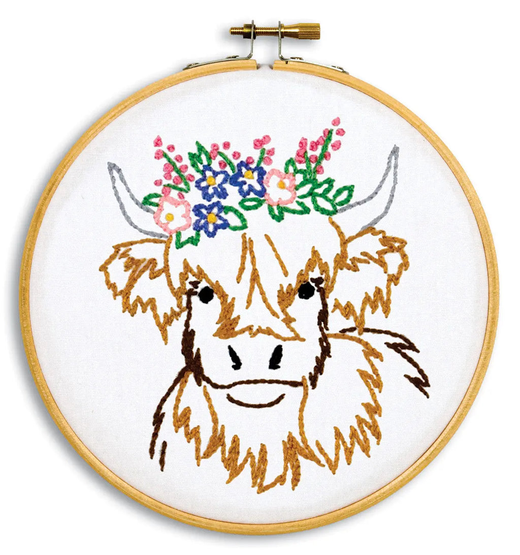 Highland Cow 6" Hoop Kit: Everything is included in this kit: your stamped pattern, floss, needle & hoop. You will be able to frame, hang and display your finished embroidered creation. Kit contains: stamped design, 6in wood hoop, instructions, floss & needle.