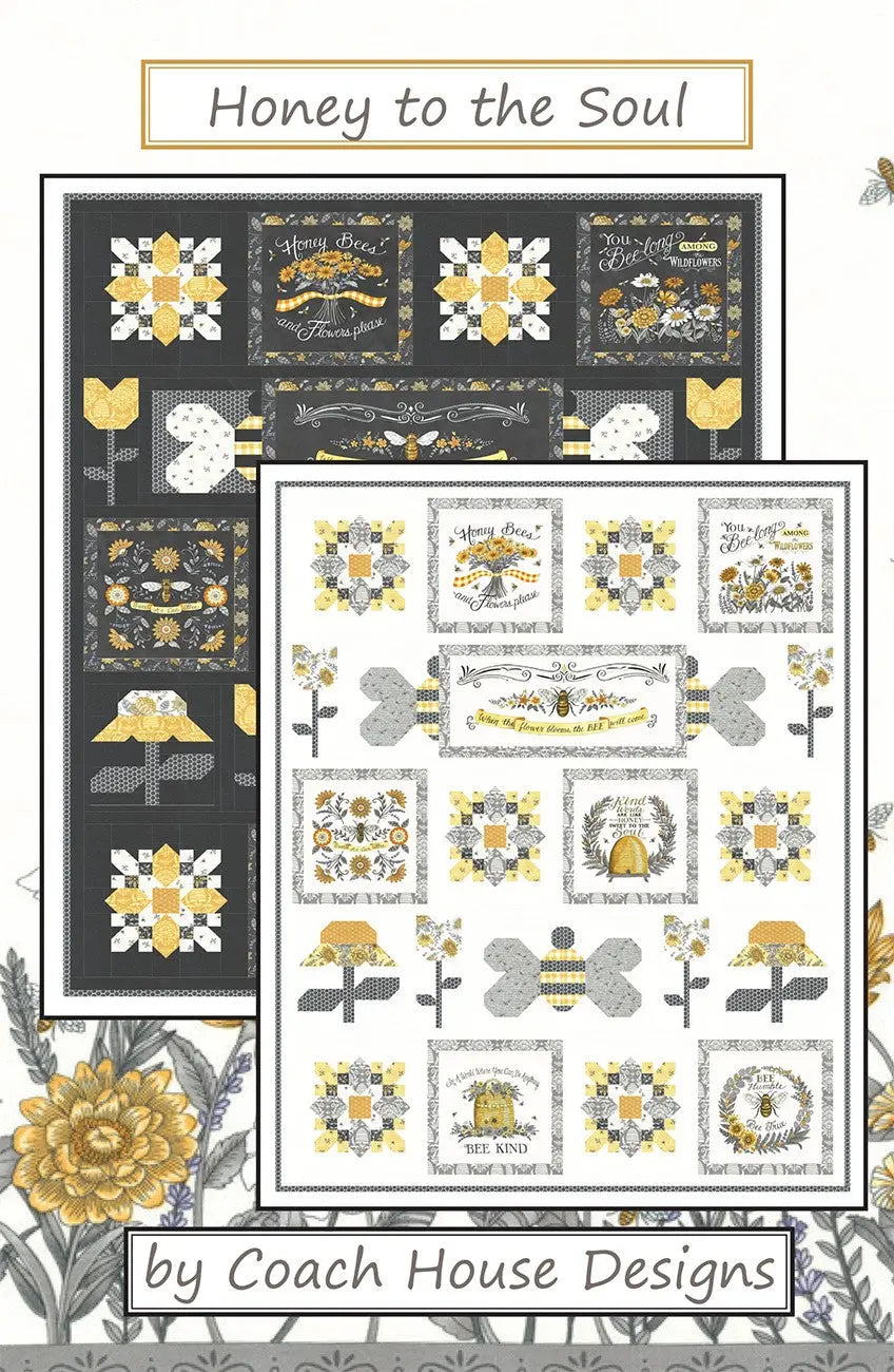 Pattern includes instructions for dark quilt featuring the black panel and a light quilt featuring the white panel from Deb Strain's Honey & Lavender fabric line. The quilts measure 50" x 62" and depicts bees and flowers and pieced blocks. All piecing.