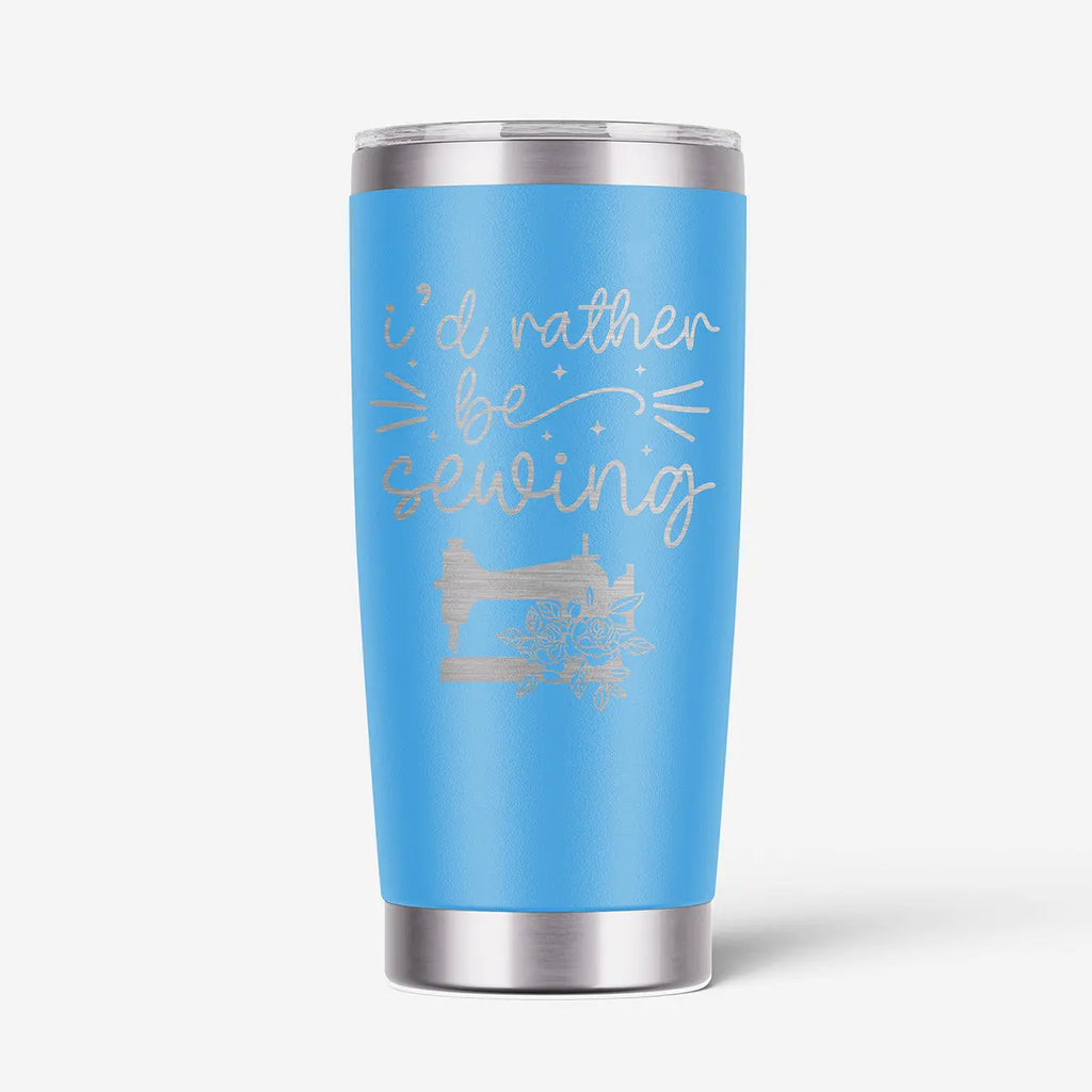 This 20 oz tumbler is laser engraved with "I'd Rather Be Sewing". These high-quality, double wall, vacuum-sealed tumblers keep drinks cold or hot for hours on end and fit perfectly in a standard size cup holder. Top rack dishwasher or hand wash. Do not use in microwave.