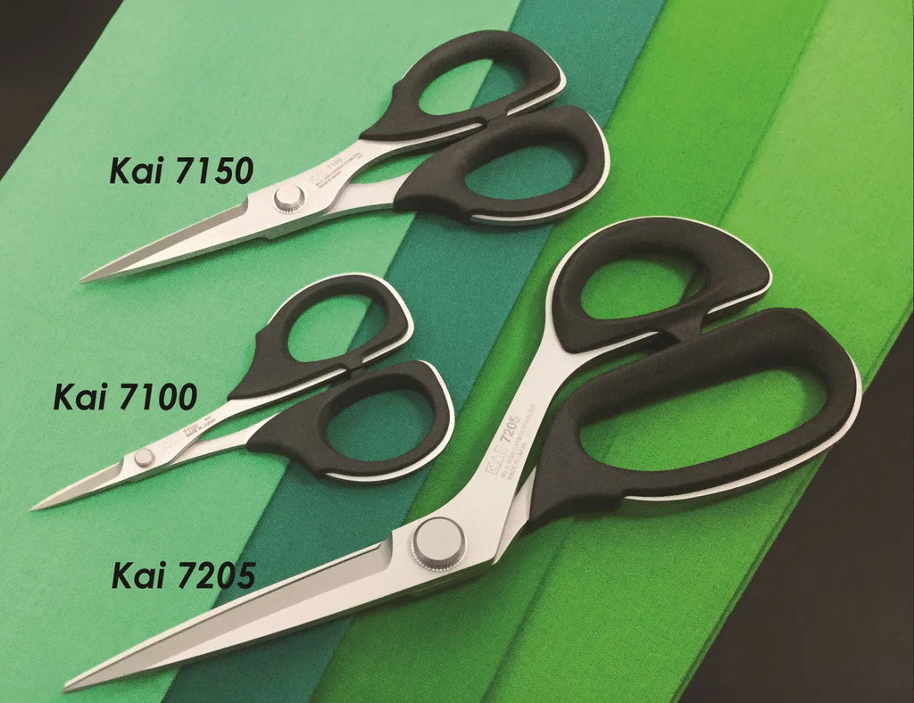 KAI GS7 3 Piece Set: The Kai 7000 Professional Series Set includes our most popular 7000 Series Shears. They are made of a heavy-duty, high-carbon stainless steel which allows these sewing shears to be sharpened at a steeper angle and allows them to maintain their cut-life and durability over time. If you are looking for high quality professional sewing shears that are great on cottons, denims, silks, fleece, and even Carbon fiber, Kevlar®, and Nomex® then you have come to the right place. This set includes the following: 1 pair of 7100 (4 1/4" Professional Scissor) Ideal for tasks that require a small but powerful cutting tool. Being the smallest of the 7000 series scissors, the 7100 is better suited for detailed projects. 1 pair of 7150 (6" Professional Scissor) Perfect size for tasks such as trimming "dog ears", clipping threads for chain-piecing, or any task where larger shears would be too bulky, but cutting power is still desired. 1 pair of 7205 (8" Professional Shears) The Kai 7205 is ideal for all types of light and heavy materials. This shear is stronger and lighter than traditional shears of the same size. It also features handles made of "Elastomer", a soft plastic, which is designed for better leverage and ease of handling while cutting.