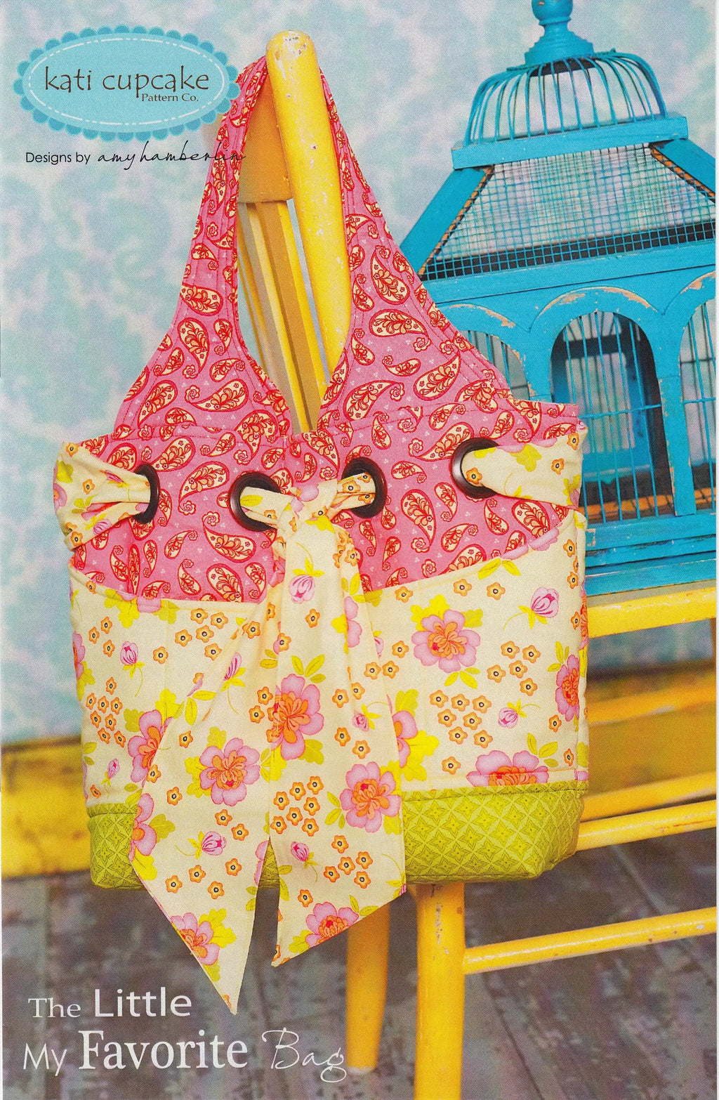 Little My Favorite Bag: This vibrant and charming bag, measuring 12 inches wide, 12 inches high, and 5 inches deep, is perfect for adding a splash of color to any outfit or setting. The bag features a delightful combination of pink floral patterns on the main body and a contrasting yellow and white floral print on the lower section, accented with a green base. A playful bow with pink and orange flowers adorns the front, tied through two large grommets, adding a whimsical touch. The bag is displayed against a backdrop of a yellow chair with a blue birdcage, enhancing its cheerful aesthetic. Ideal for carrying diapers and wipes or extra essentials, this bag is both stylish and practical.
