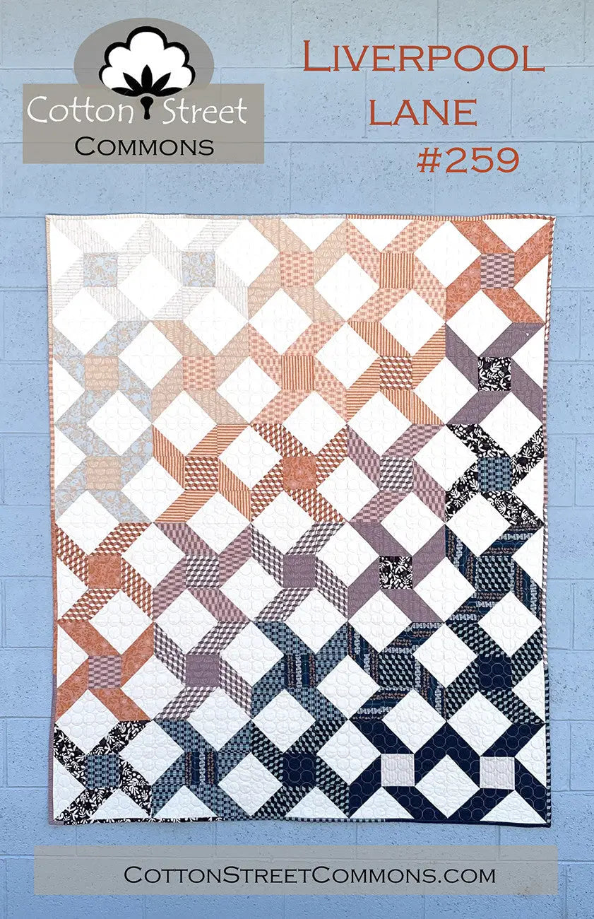 Liverpool Lane: This Half Square Triangle is a great quilt for all styles of fabric. With just 15 fat quarters and background fabric it is easy to kit. The options for layout are numerous. I did an ombre effect which has easy instructions to create. It appeals to both modern quilters and traditional quilters. The quilt is 60" x 72".