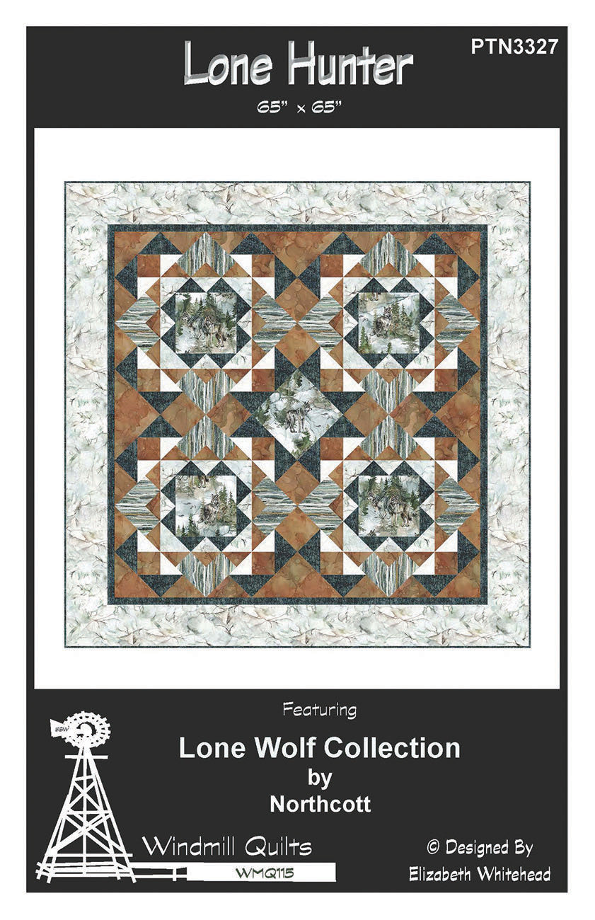 Lone Hunter is a 65" x 65" throw sized quilt featuring the Lone Wolf Collection by Northcott. The quilt features the wolf print with coordinating fabrics from the collection and is traditionally pieced. The pattern included special instructions for cutting directional prints.