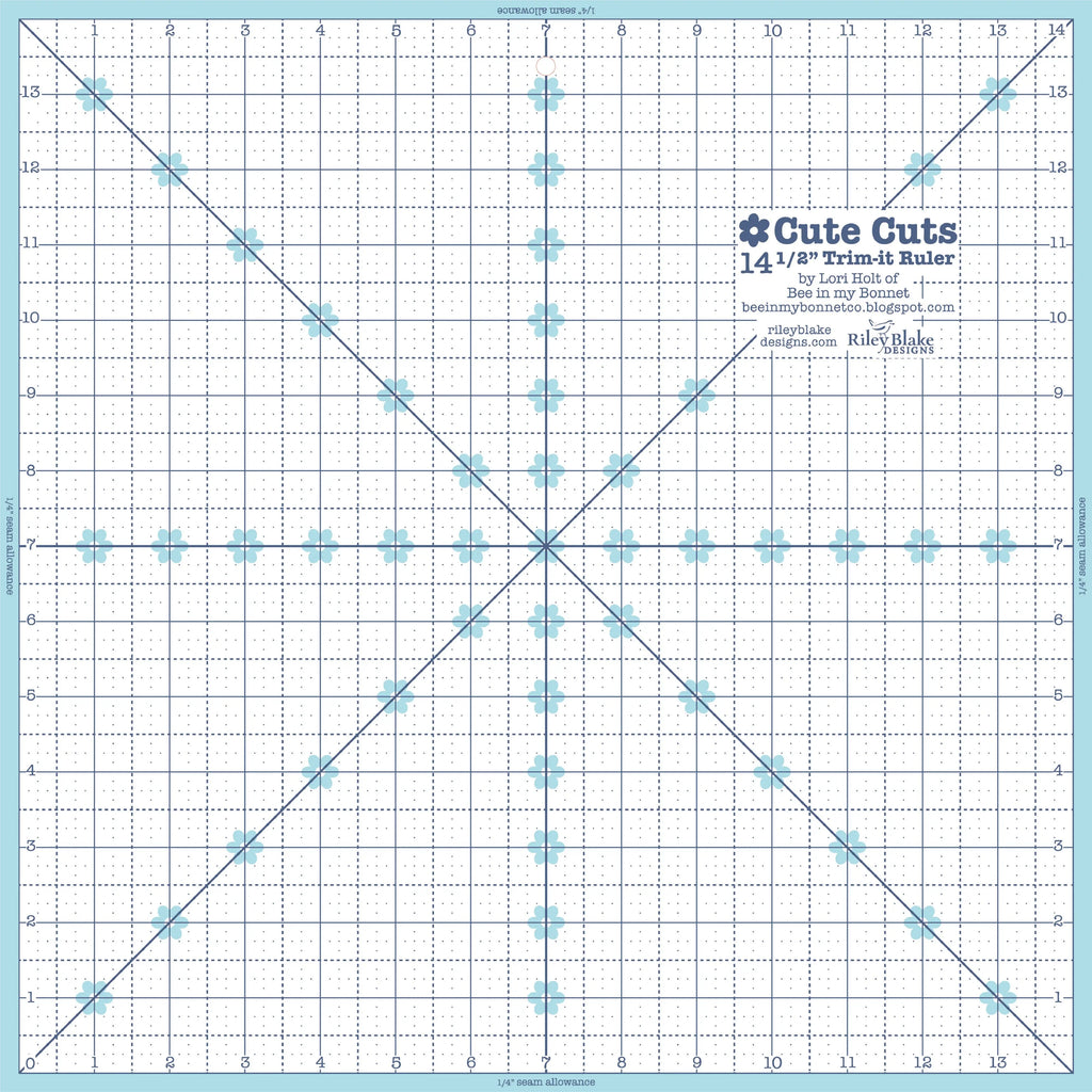 Lori Holt Trim It Ruler 14.5" Square: The Trim-it™ Rulers by Lori Holt of Bee in my Bonnet are non-slip and easy to use for trimming up your blocks after piecing, applique or embroidery. Use the diagonal lines to easily center your block when trimming and use the colored outside 1/4in seam allowance marks to help you see what will show of your block after sewing it into your quilt. The ruler has aqua and denim markings printed in 1in grids marked in 1/8in and 1/4in increments.