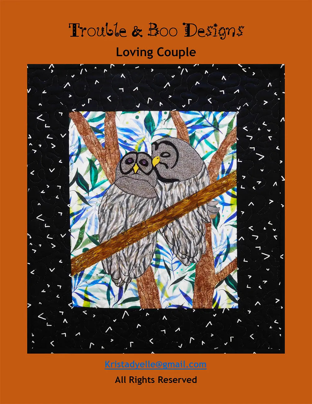 Loving Couple: Bordered wall hanging (approximately 19” x 17”) of an endearing pair of brown owls perched in a large leafy tree. Executed in raw-edge, fused & machine-stitched applique.