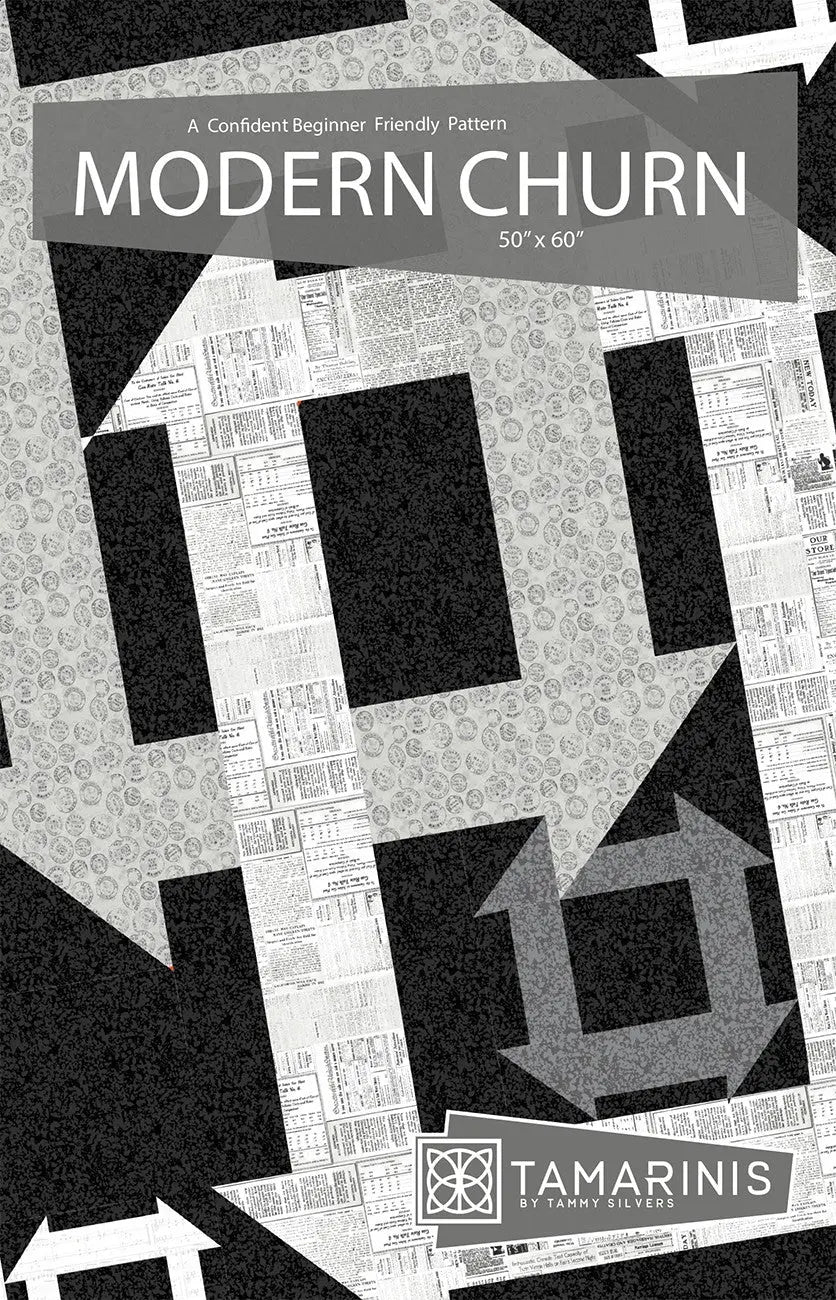 The traditional Churn Dash block gets a modern update with this fun lap quilt, showing overlapping and stretched churn dash blocks in a crisp cool color scheme. Great for confident beginners. The finished quilt is 50" x 62".