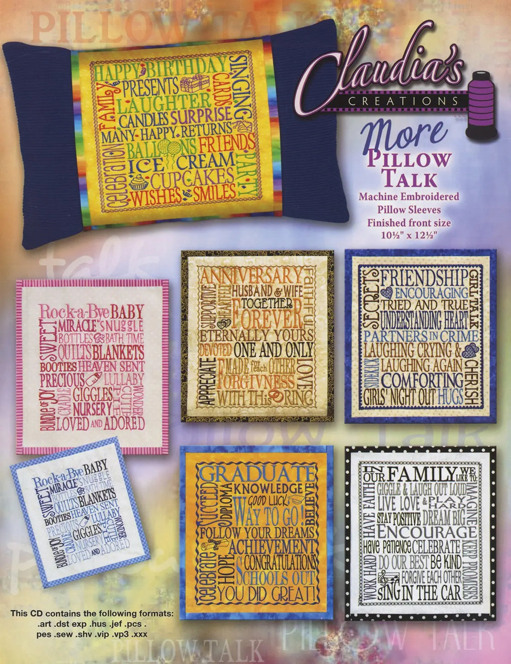 More Pillow Talk: Machine Embroidered Pillow Sleeves. Finished front size 10-1/2in x 12-1/2in. This CD contains formats: .art .dst .hus .jef .pcs .pes .sew .shv .vip .vp3 .xxx