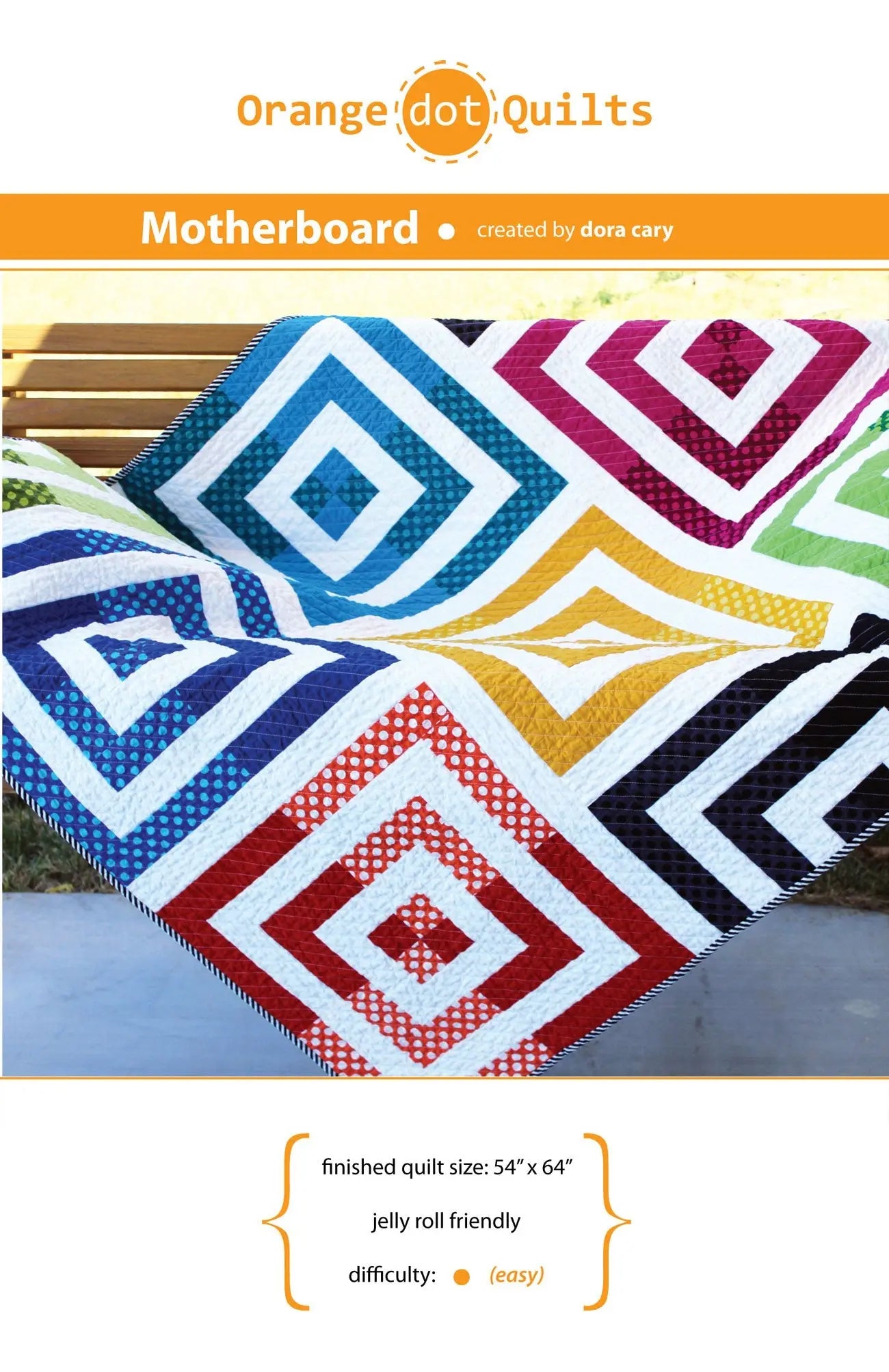 The pattern was inspired by a charming Jelly Roll of modern solids and polka dots found in a wonderful little fabric shop in California. The design reminds me of chips on a computer motherboard. I recreated it, with more blocks, solids and batiks and a dark background, for my husband. He loves it! Finished quilt size: 54"" x 64"" Full color pattern on letter size paper folded in half. Size of folded pattern: 5.5”w x 8.5”h. Comes in clear plastic bag with hang hole. Bag height: 9.75”