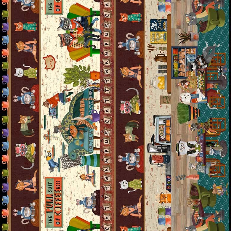 Multi The Cat Cafe Purrsuit of Coffeeness Cotton 44"/45" Fabric Per Yard: