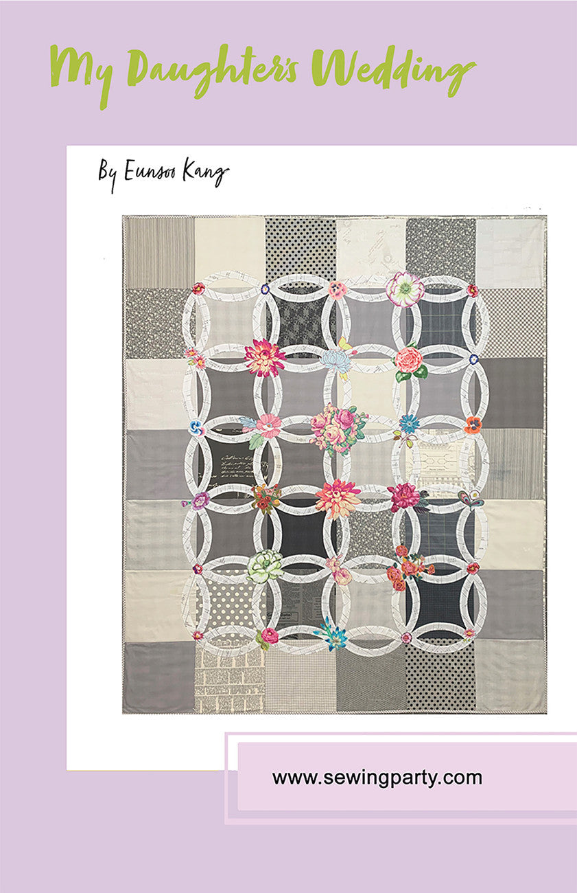 This pattern is a playful take on the traditional double wedding ring. The flower centers simulate the beautiful bouquet that often accompanies the exchanging of wedding rings. This version has a variety of prints/colors for the background and the rings are all the same color, making it easy to see the shapes of both the rings and the squares. Instead of using curved piecing to create the wedding rings, this pattern uses the technique of machine applique for easy cutting and sewing.