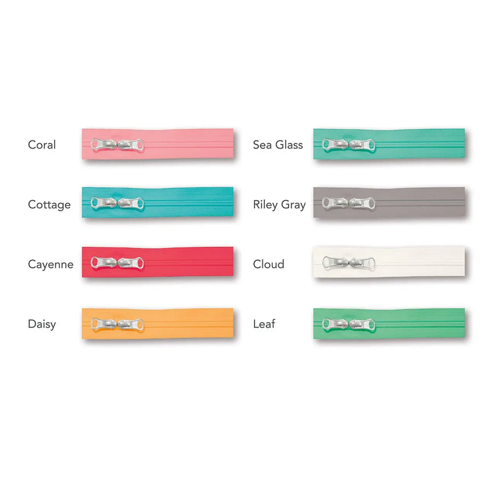 The Happy Zippers by Lori Holt of Bee in my Bonnet come in a package of 8 different zippers in Lori's fun colors. Each zipper is 1" x 16" and has 2 zipper pulls.