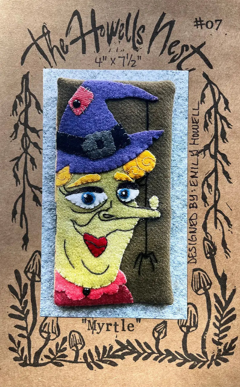 Myrtle Thornweb: Original wool applique pattern designed by Emily Howell. Finished product measures 4in x 7.5in. This pattern includes drawing, description and instructions. Myrtle will make the cutest whimsical addition to your Fall decor. Pattern is designed for all skill levels. Myrtle is a glitzy witch, with plenty of personality.