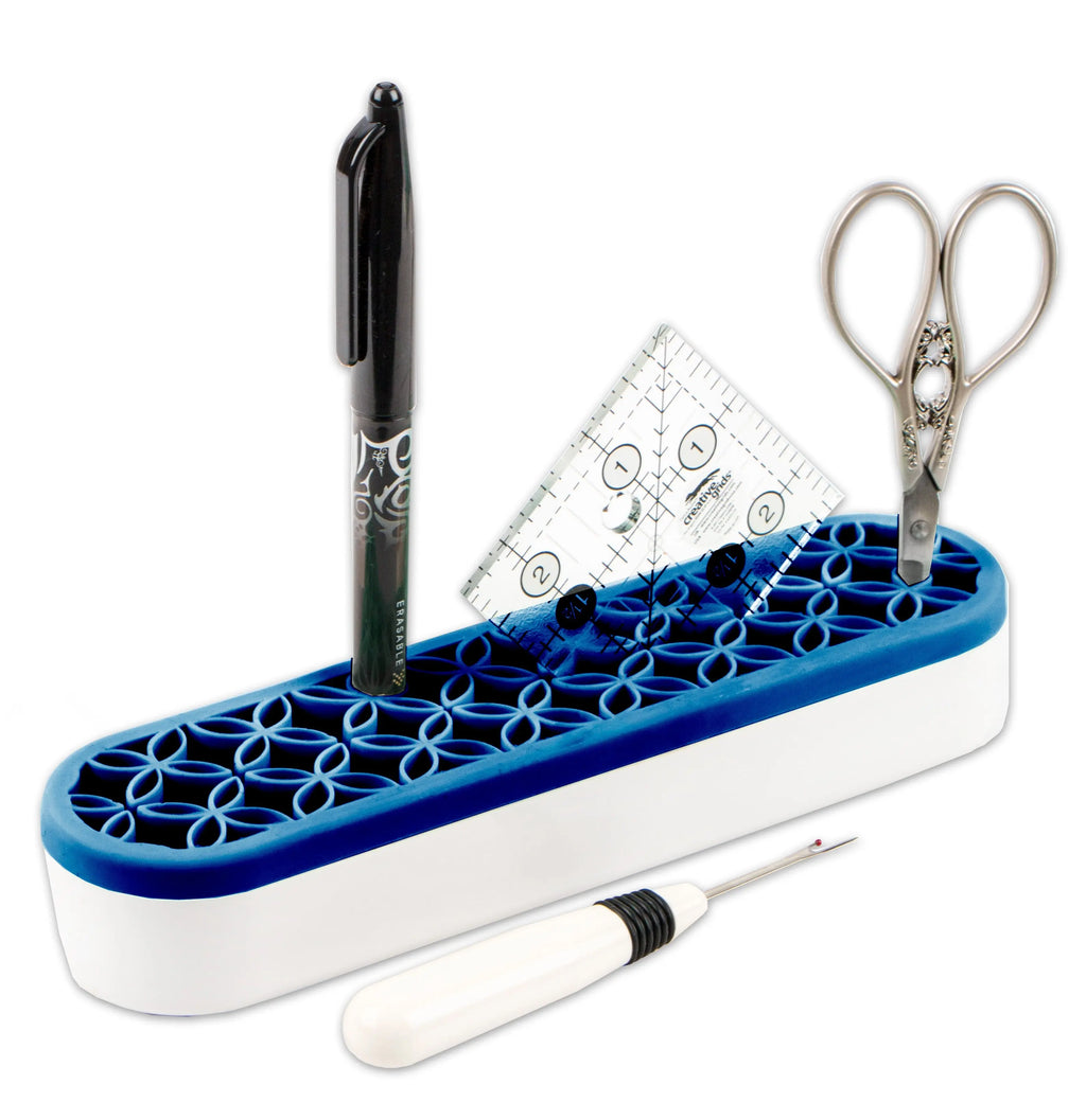 The new Stash ‘n Store is the perfect device to keep your sewing and crafting notions within arm’s reach and ready to go! Easily store marking tools, scissors, stilettos, rulers, even brushes and small rotary cutters, in an easy-to-grab upright position. The silicone pockets are smooth and offer a sturdy grip and it is also simple to clean. Size: 1.5in x 2in x 8.25in
