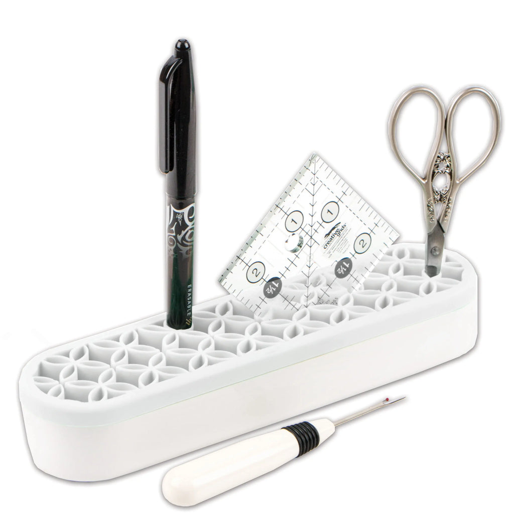The new Stash ‘n Store is the perfect device to keep your sewing and crafting notions within arm’s reach and ready to go! Easily store marking tools, scissors, stilettos, rulers, even brushes and small rotary cutters, in an easy-to-grab upright position. The silicone pockets are smooth and offer a sturdy grip and it is also simple to clean. Size: 1.5in x 2in x 8.25in