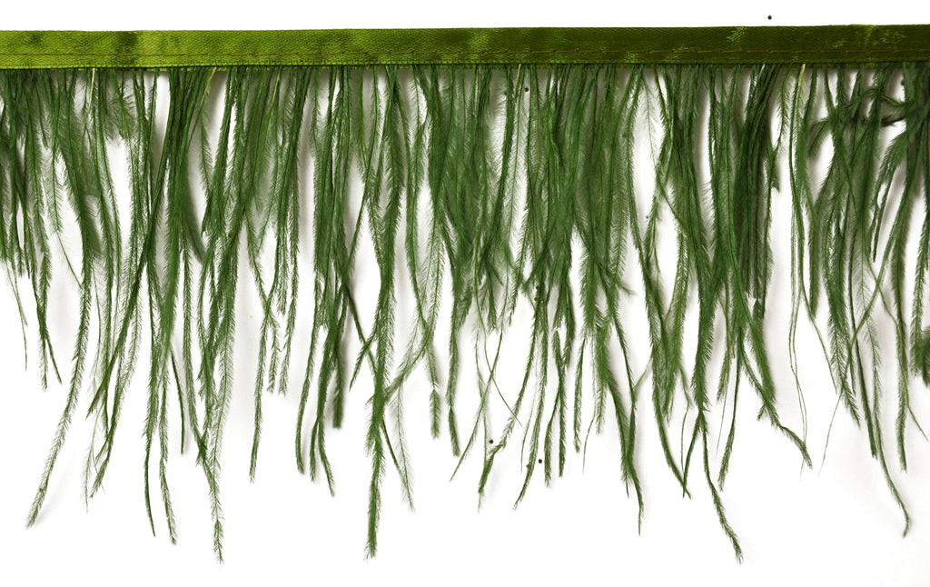 6 Inch Long Feather Trim comes in 11 yard rolls. On a cardboard bolt. Color = OLIVE