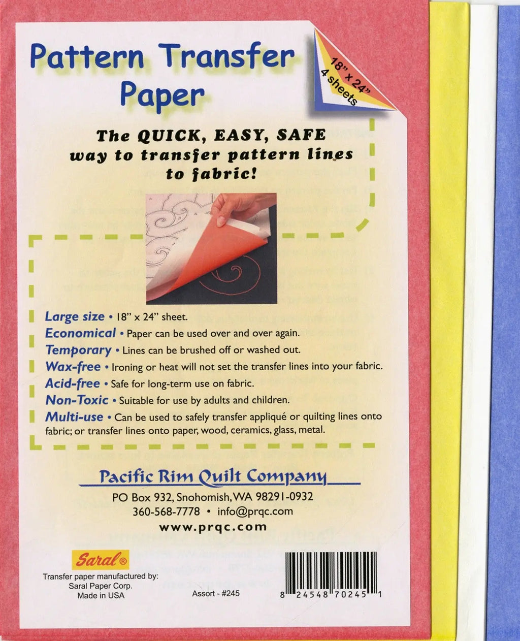 For precision tracing of applique or quilting lines onto fabric. Contains no wax or grease; erases like pencil, washes out of fabric; economical--can be used again and again. This is the product we recommend for transferring our 2 Fabric Applique Quilt patterns onto dark fabric. Each sheet is 18in x 24in. The assortment includes one sheet each: Red, Blue, White and Yellow