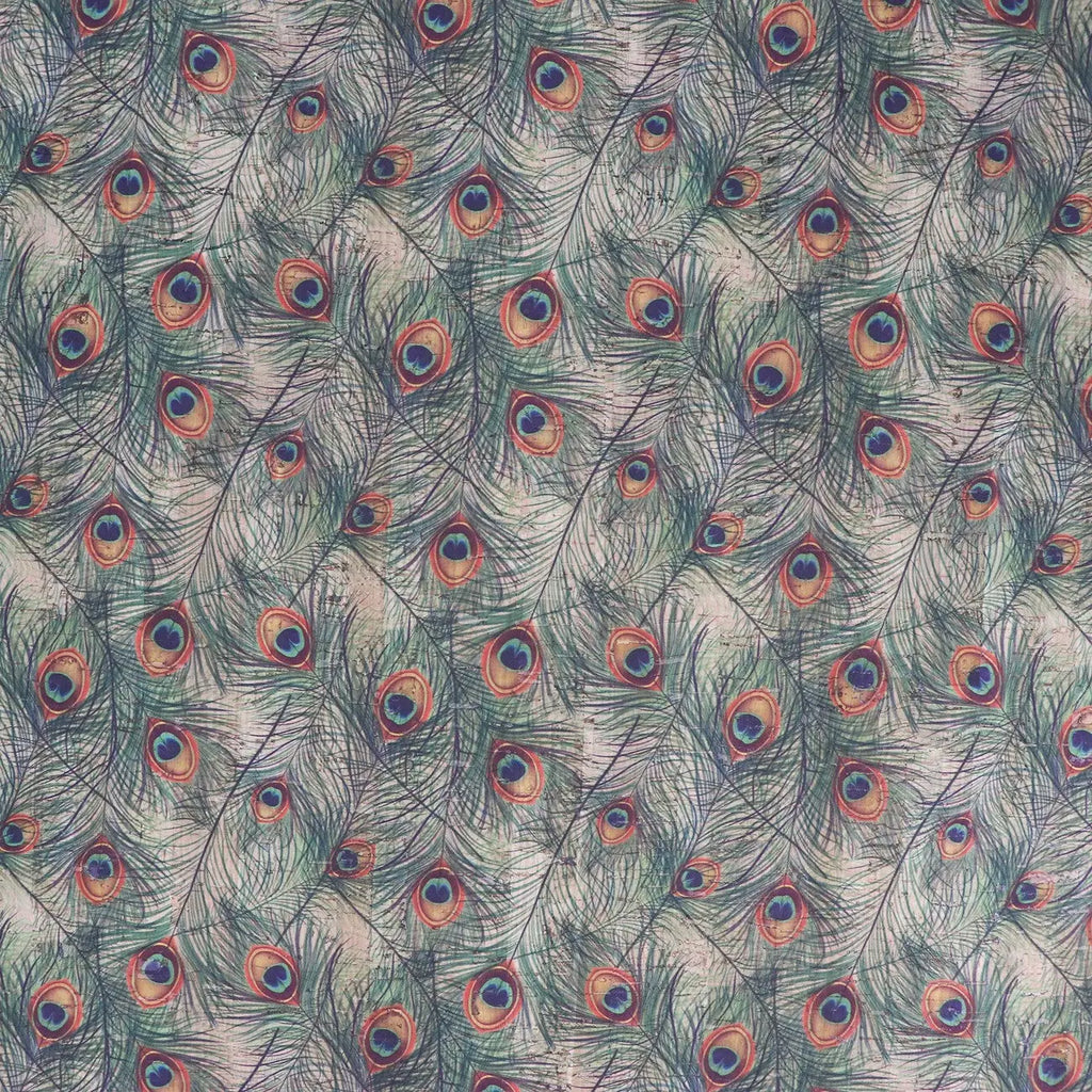 Peacock Pro Cork 1/2 yard: High quality cork fabric with fabric support backing. Cork fabric is environmentally and ecologically friendly. This material is an amazing alternative to leather or vinyl because it is sustainable, washable, stain resistant, durable, antimicrobial and hypoallergenic. Cork fabric has a similar handle to leather or vinyl. It feels like a quality leather: it’s soft, smooth, and pliable. It is not hard or brittle. Cork fabric looks stunning and unique. Use it to make handmade bags, wallets, accents on clothing, craft projects, applique, embroidery, shoes, or upholstery. The fabric support backing is a Polyester base. The fabric is about .8mm thick. Cork is 25 - 27 inches wide.
