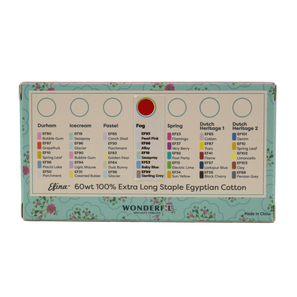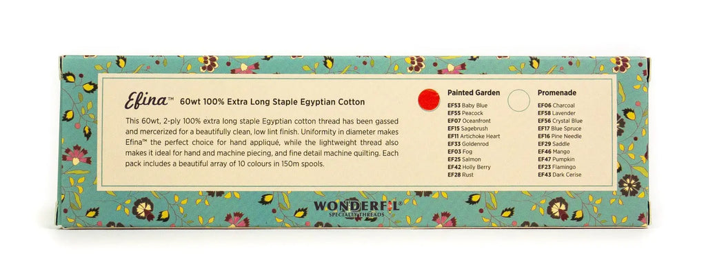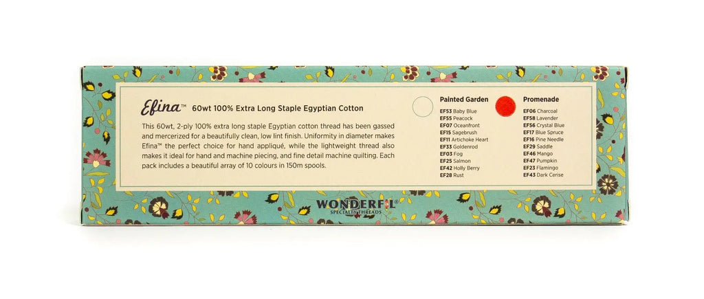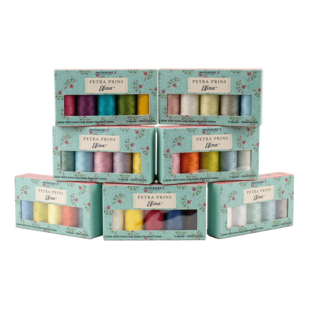 Petra Prins Patchwork & Quilting and WonderFil® bring you this new thread collection of 60wt cotton, Efina™. Petra Prins is a Dutch fabric designer and author with an incredible eye for design. These packs provide the perfect assortment of colours to pair with her fabric collections and quilt designs and can be used for hand and machine piecing, appliqué, and fine detail machine quilting. Each pack contains a collection of 10 spools of this ultra low lint cotton thread line.